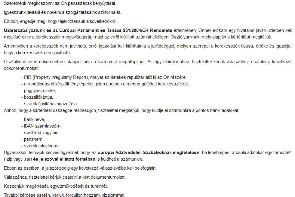 Mivel PIR papírom nem volt, és 7 napon belül nem jutottam el ismét a reptérre, ahogy azt az Légi Személy és Poggyászfuvarozási Üzletszabályzatuk 18.1.3. pontja kimondja,